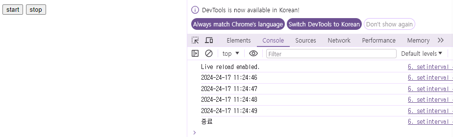 다시 시작 버튼을 누르면 시간이 다시 출력되기 시작) - 콘솔