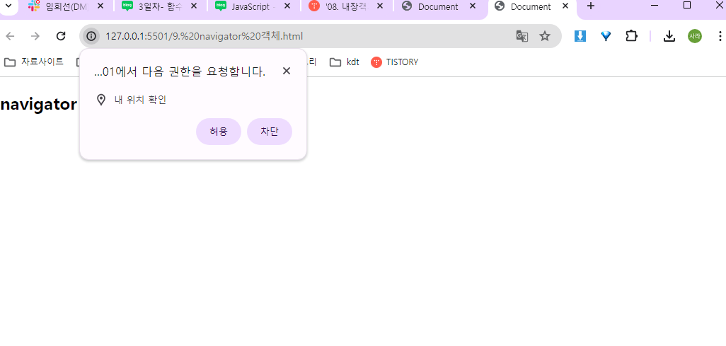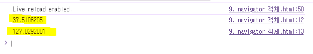 - navigator.geolocation: 웹 브라우저의 위치 정보 서비스에 접근할 수 있는 API를 제공하는 내장 객체