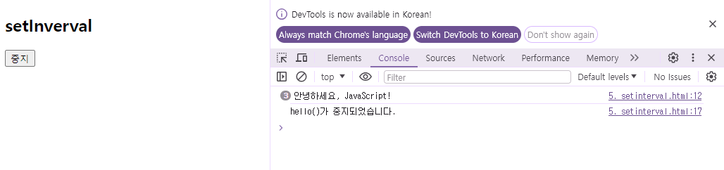 ![]() '1초'마다 실행됨 '중지' 누르면 멈춤 |
