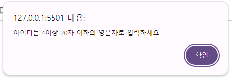 alert('아이디는 4자이상 20자이하의 영문자로 입력하세요');
