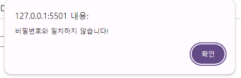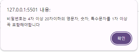 alert('비밀번호는 4자 이상 20자이하의 영문자, 숫자, 특수문자를 1자 이상 꼭 포함해야합니다')