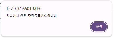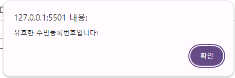 - <input type="password" name="ssn2" id="ssn2" maxlength="7"> <button type="button">주민등록번호 검증</button> </p> <p>우편번호: <input type="text" name="zipcode" id="zipcode" maxlength="5">
