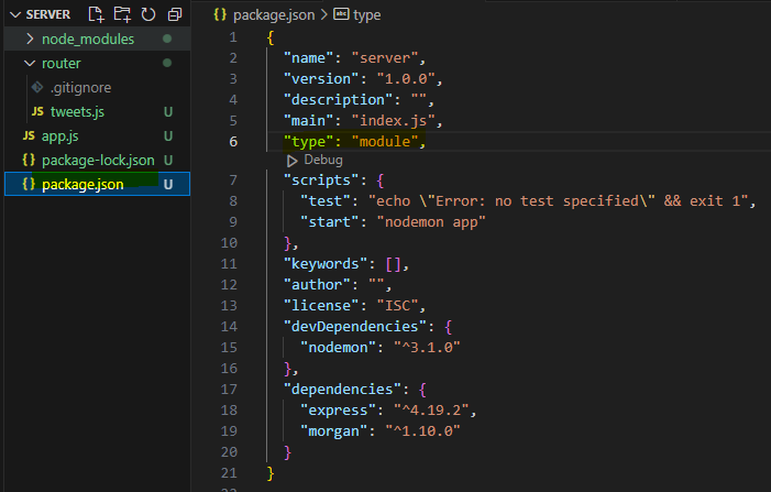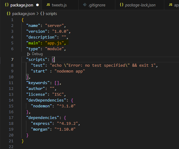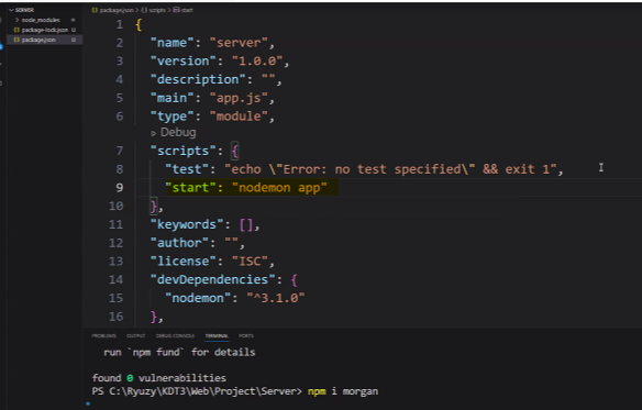 package.json 파일에서 "start":"nodemon app" 입력