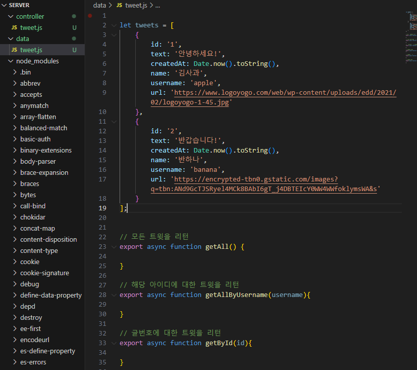 - router> tweets.js 에 있던 데이터 ---> data> tweets.js 에 분리하기