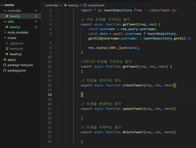 - router > tweets.js 에 있던 함수 ---> controllar > tweets.js 에 분리하기
