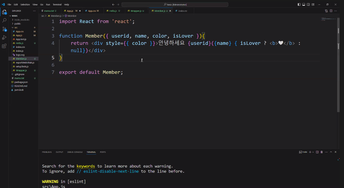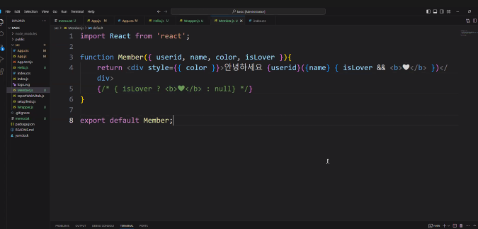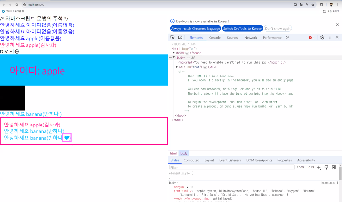 return <div style={{color}}>안녕하세요{userid}({name}{isLover && <b>❤</b>})</div>