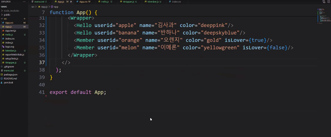 <Member userid="orange" name="오렌지" color="gold" isLover={true}/>
