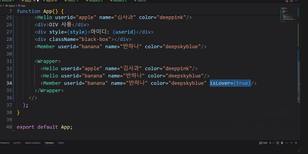 <Member userid="banana" name="반하나" color="gold" isLover={true}/>