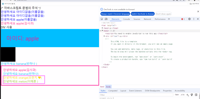 return <div style={{color}}>안녕하세요{userid}({name}{isLover? <b>❤</b>:null})</div>