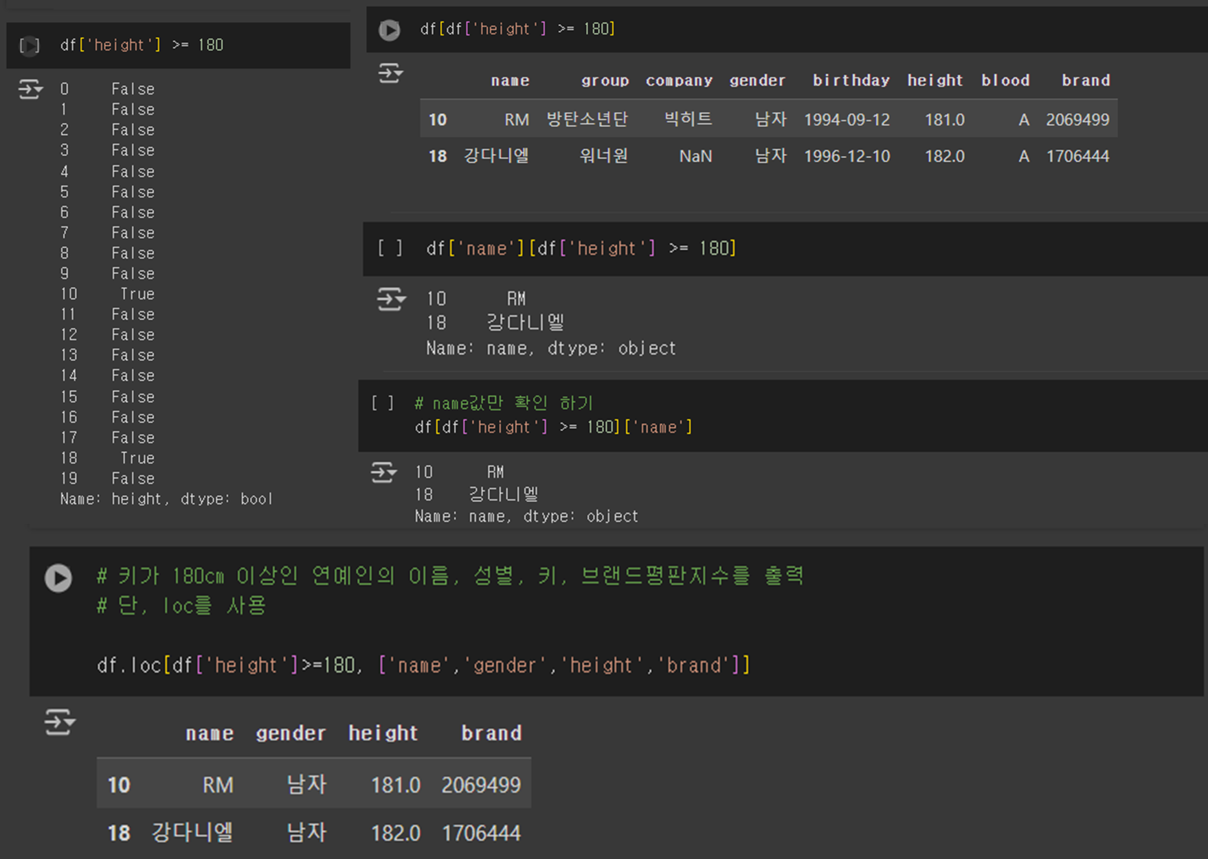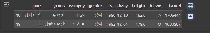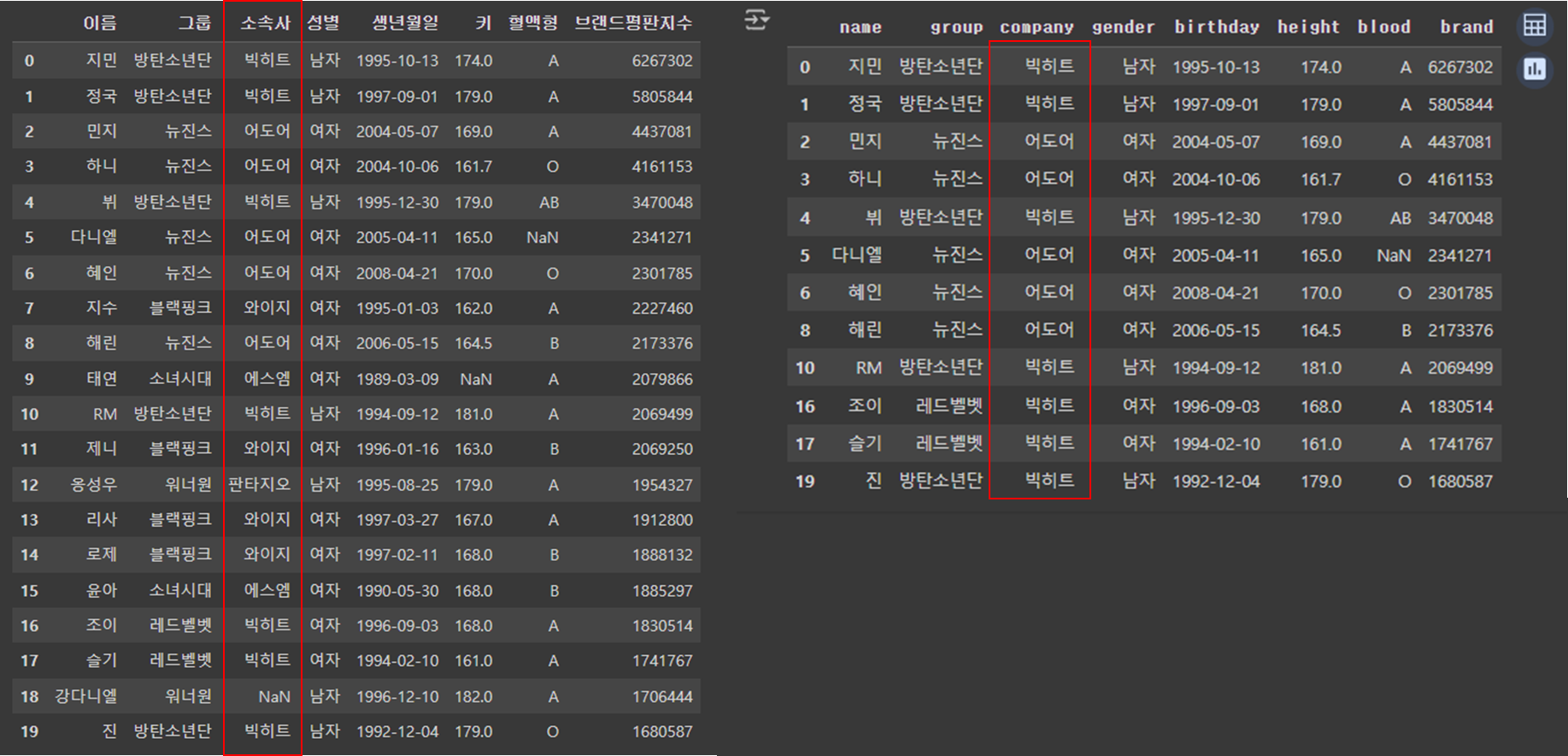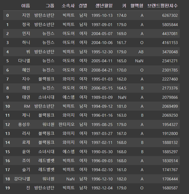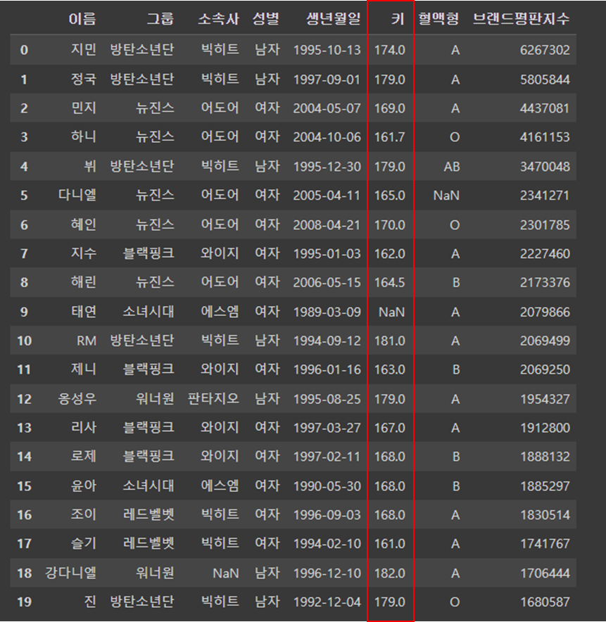 ![]() * count: null이 아닌 수 * unique: 중복되지 않은 유니크한 값의 수 이름 20개(다 다름 , unique) 그룹 6개 소속사 5개 성별 2개 생일 20개 * top: 맨위 있는 사람들 표시, 최빈값 (가장 많은 종류) * freq: 최빈값에 있는 갯수 |