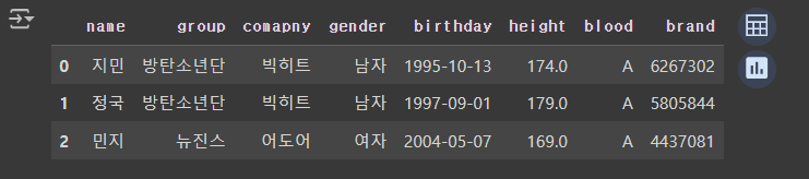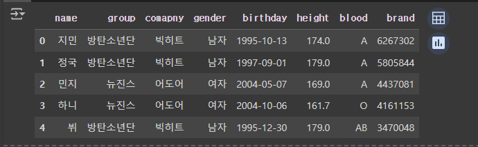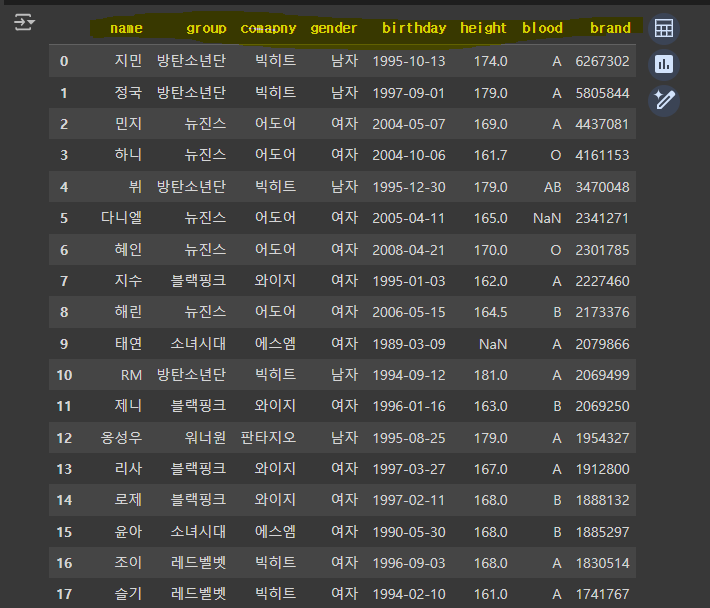 new_columns = ['name', 'group', 'comapny', 'gender', 'birthday', 'height', 'blood', 'brand']