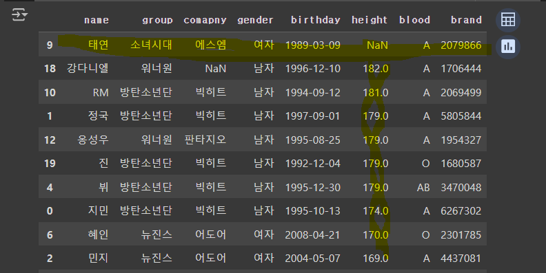 df.sort_values(by='height', ascending=False, na_position='first') #키로 내림차순 정렬 #null값을 첫번째로