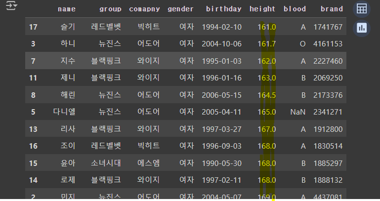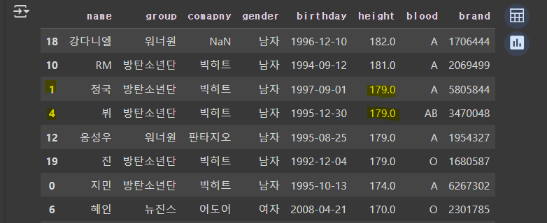 df.sort_values(by='height', ascending=False) #키로 내림차순 정렬