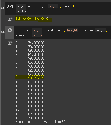 # 'height' 열에서 누락된 값(NaN)을 계산된 평균 값으로 대체한 후 출력합니다.