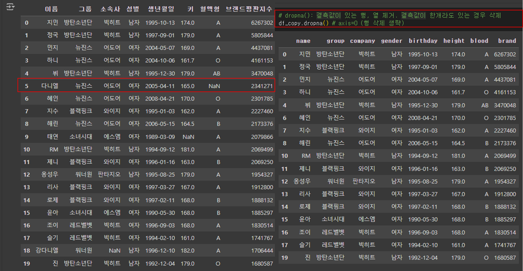 - dropna()를 사용하여 결측값이 있는 행, 열 제거