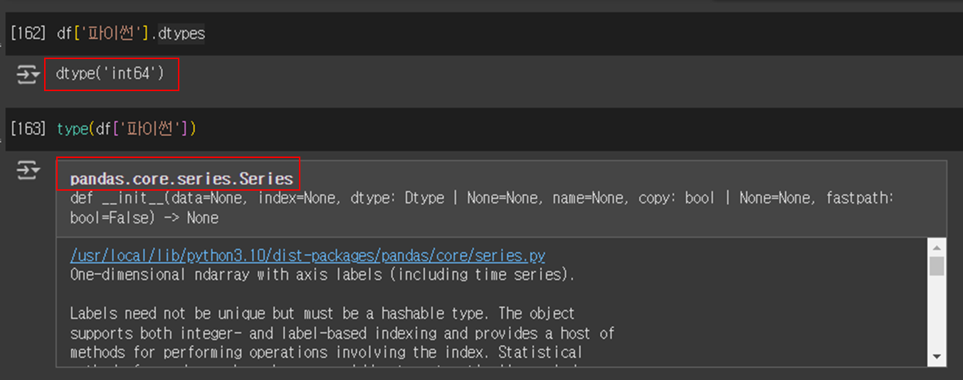 # '파이썬' 열의 데이터 타입을 확인합니다. 결과는 'Series' 타입입니다.
