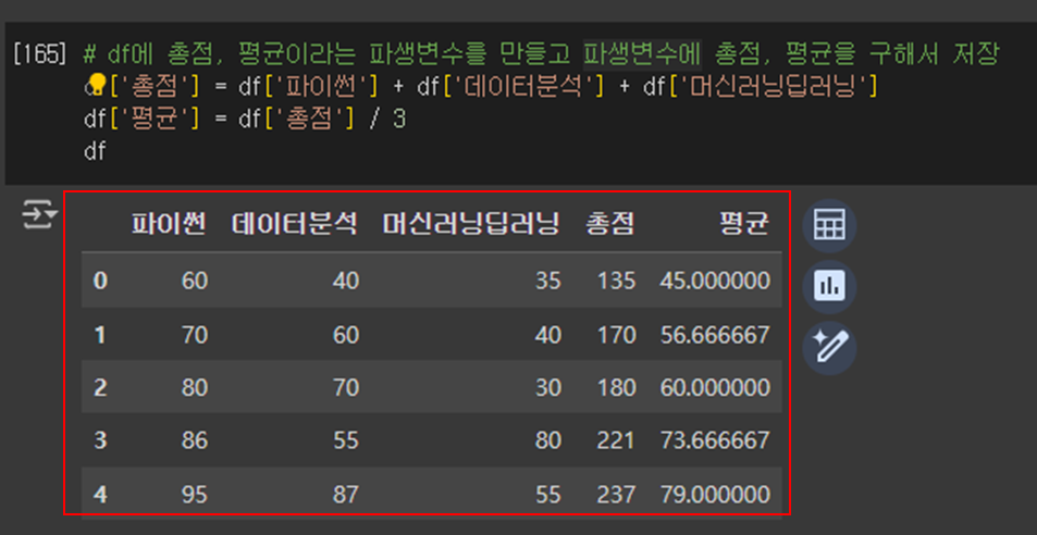 - df에 총점, 평균이라는 파생변수를 만들고 총점, 평균을 구해서 저장