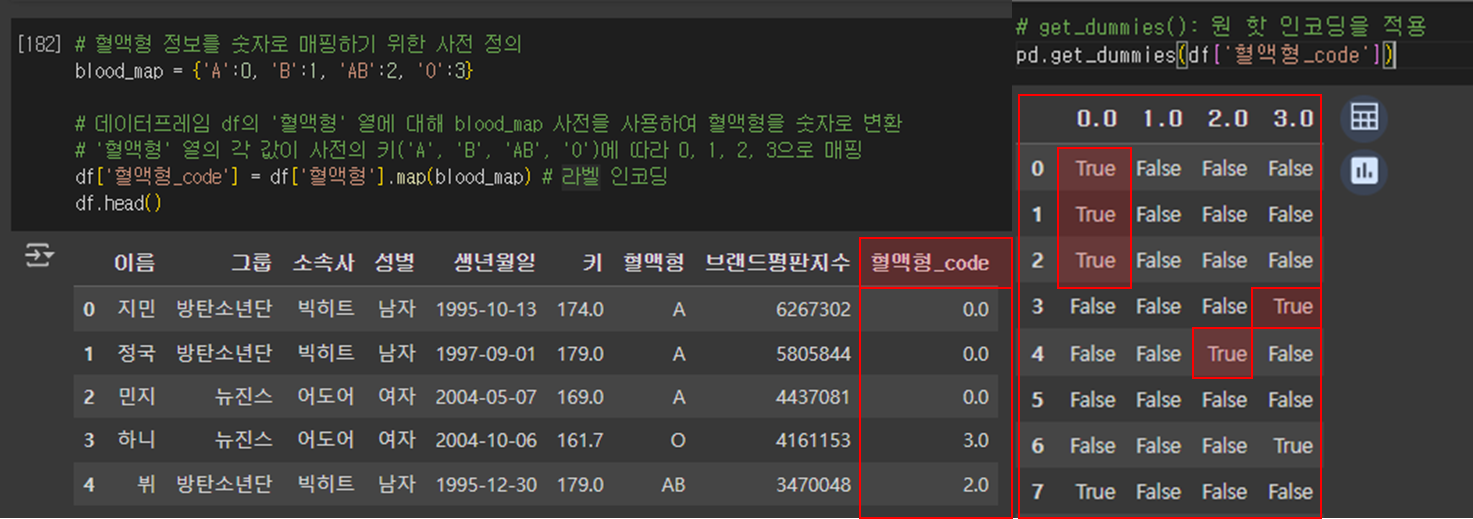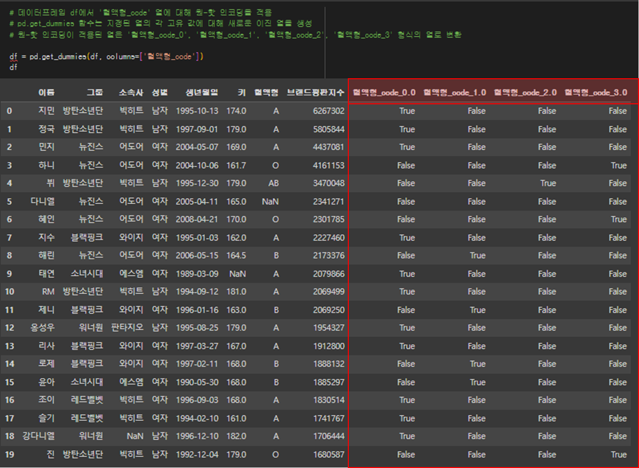 # 원-핫 인코딩이 적용된 열은 '혈액형_code_0', '혈액형_code_1', '혈액형_code_2', '혈액형_code_3' 형식의 열로 변환