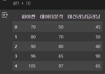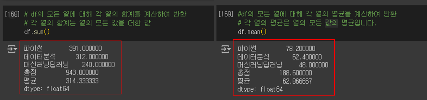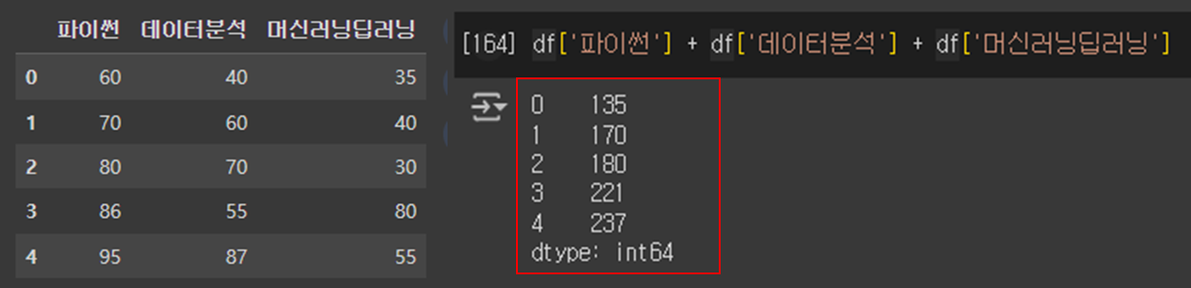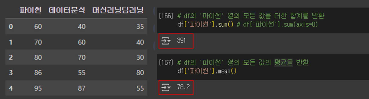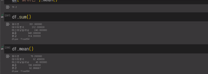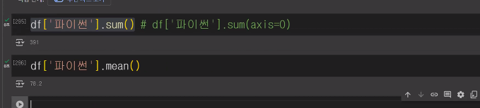 df['파이썬'].sum() # df['파이썬'].sum(axis=0)