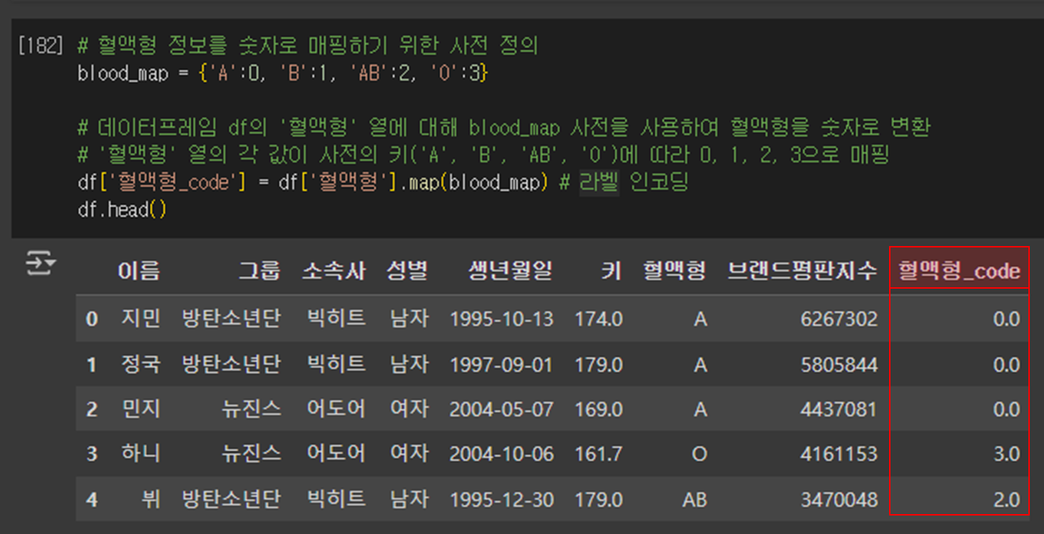# 데이터프레임 df의 '혈액형' 열에 대해 blood_map 사전을 사용하여 혈액형을 숫자로 변환
