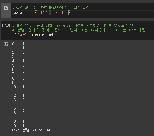 # df의 '성별' 열에 대해 map_gender 사전을 사용하여 성별을 숫자로 변환