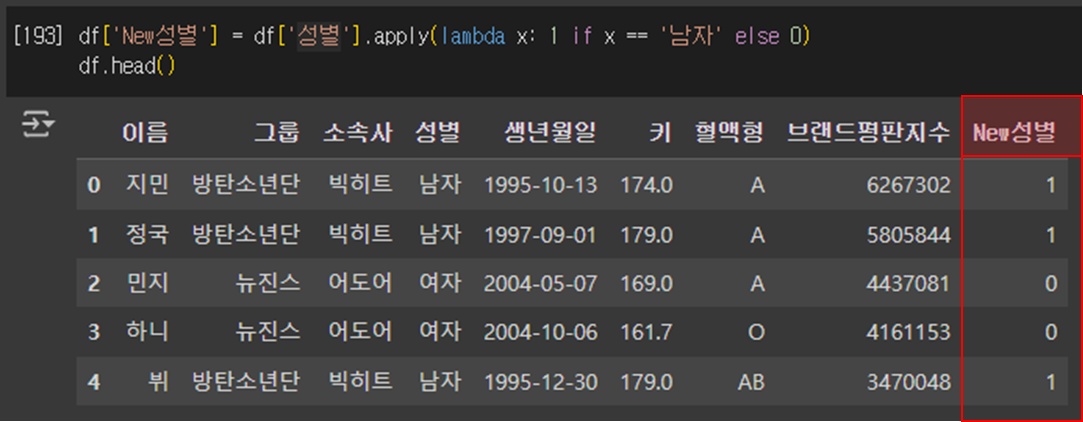 df['New성별']=df['성별'].apply(lambda x:1 if x=='남자' else 0)