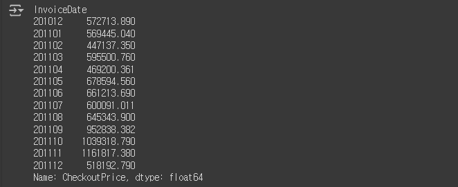 rev_by_month = retail.set_index('InvoiceDate').groupby(extract_month)['CheckoutPrice'].sum()