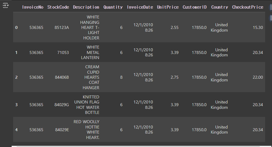 # 총 지출비용(CheckoutPrice) = 가격(UnitPrice) * 수량(Qunatity)