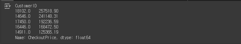 vvip = retail.groupby('CustomerID')['CheckoutPrice'].sum().sort_values(ascending=False).head()