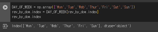 rev_by_dow.index = DAY_OF_WEEK[rev_by_dow.index]