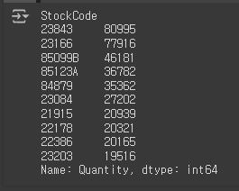 # 'StockCode'별로 'Quantity'의 합계를 계산한 후, 합계가 큰 순서대로 정렬하여 상위 10개를 선택합니다.