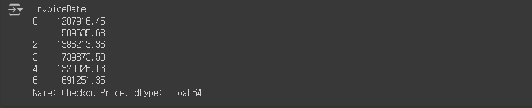 # rev_by_dow = retail.set_index('InvoiceDate').groupby(extract_dow)['CheckoutPrice'].sum()