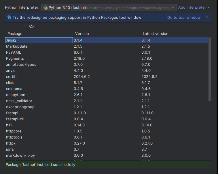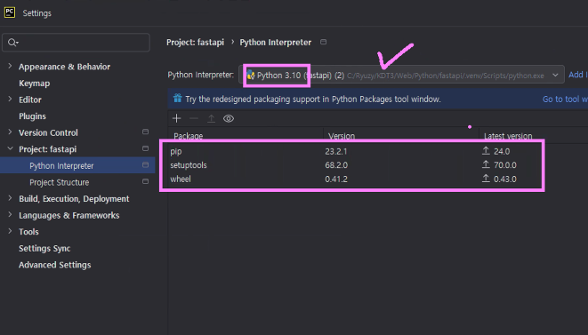 | FastAPI를 설치하기 전에 Python 가상환경을 만들어줍니다. 가상환경을 사용하면 프로젝트 간에 의존성 충돌을 방지하고 프로젝트 별로 필요한 패키지를 독립적으로 관리할 수 있습니다. |