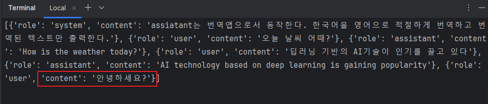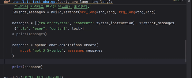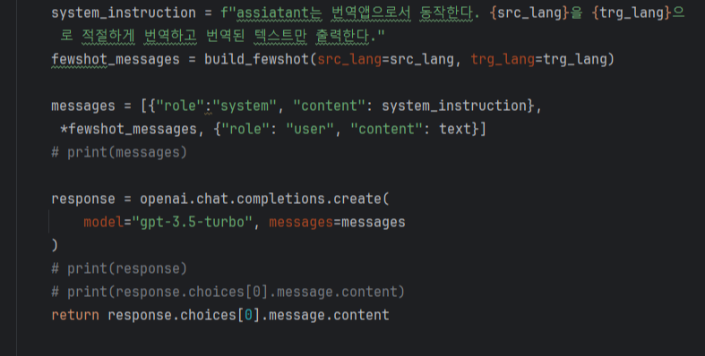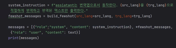 3. 시스템 명령 생성system_instruction는 모델이 번역 앱으로서 동작할 수 있도록 지시합니다. 시스템 역할의 초기 명령을 생성합니다.이 함수는 몇 가지 예제(few-shot) 메시지를 생성합니다. 예제는 소스 언어와 대상 언어로 된 문장의 쌍으로 구성됩니다. 이러한 예제는 모델이 번역을 어떻게 해야 하는지 학습하는 데 도움이 됩니다. 4. 전체 메시지 생성messages 리스트에 시스템 명령과 few-shot 예제 메시지, 그리고 번역할 텍스트를 추가합니다.
