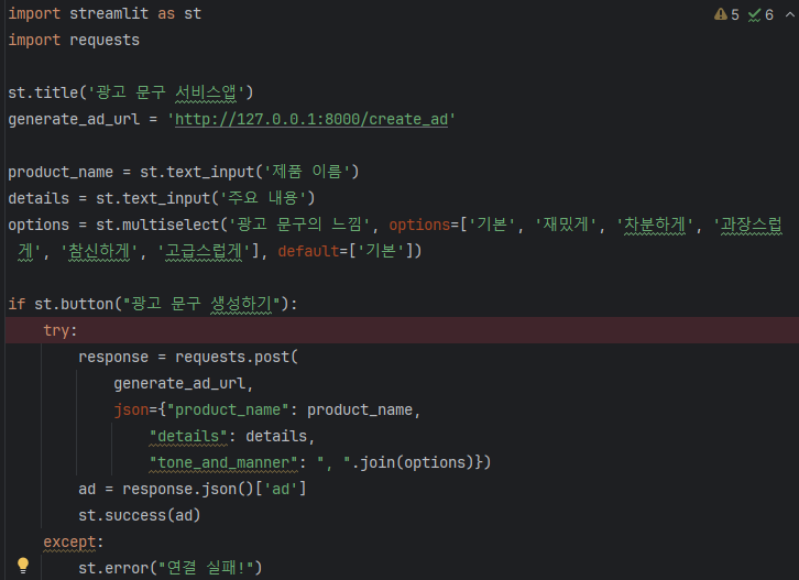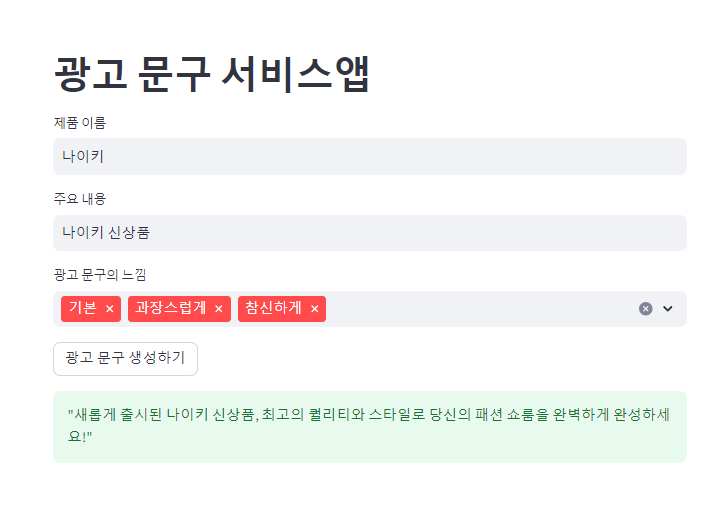 options = st.multiselect('광고 문구의 느낌', options=['기본', '재밌게', '차분하게', '과장스럽게', '참신하게', '고급스럽게'], default=['기본'])