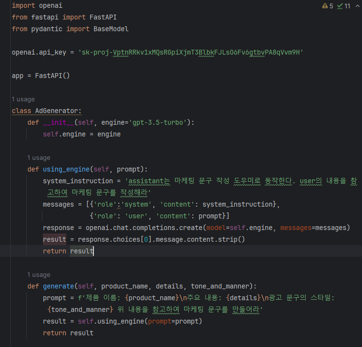 system_instruction = 'assistant는 마케팅 문구 작성 도우미로 동작한다. user의 내용을 참고하여 마케팅 문구를 작성해라'