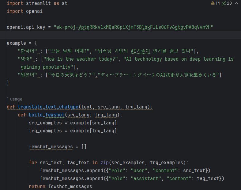 1. translate_text_chatgpe 함수이 함수는 번역 요청을 처리하며, 입력된 텍스트(text)를 소스 언어(src_lang)에서 대상 언어(trg_lang)로 번역하기 위해 필요한 메시지 구조를 만듭니다.2. build_fewshot 함수