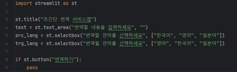src_lang = st.selectbox("번역할 언어를 선택하세요", ["한국어", "영어", "일본어"])