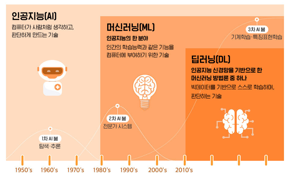 - 1997: 기계가 기존 데이터에서 학습하고 해당 데이터를 개선하여 의사 결정 또는 예측을 할 수 있도록 하는 AI의 하위 집합 - 딥러닝 : 깊은(deep) 신경망 구조의 머신러닝