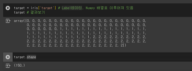 target = iris['target'] # Label데이터, Numpy 배열로 이루어져 있음