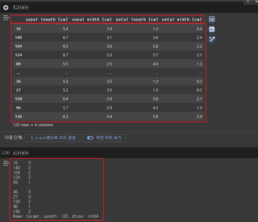- df_iris 데이터프레임 - 입력 변수(X)와 타겟 변수(y)를 나누기