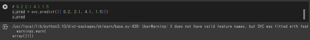 | /usr/local/lib/python3.10/dist-packages/sklearn/base.py:439: UserWarning: X does not have valid feature names, but SVC was fitted with feature names warnings.warn(array([1]) 1번 꽃씨로 예측함 |