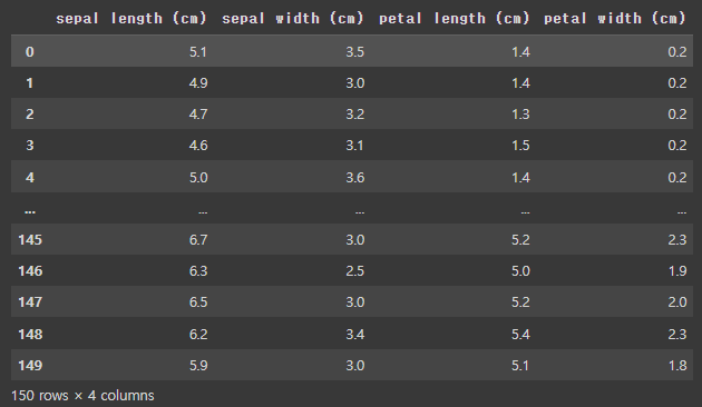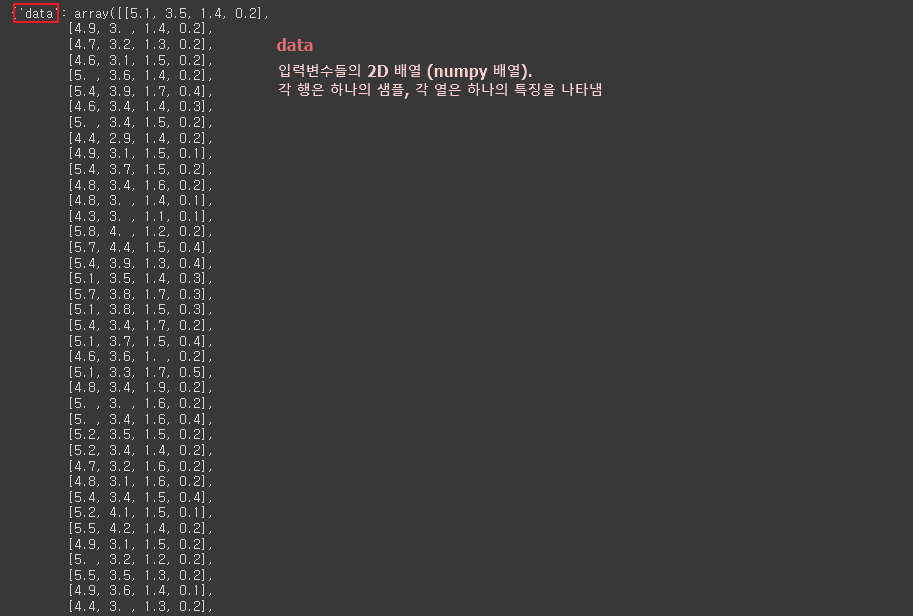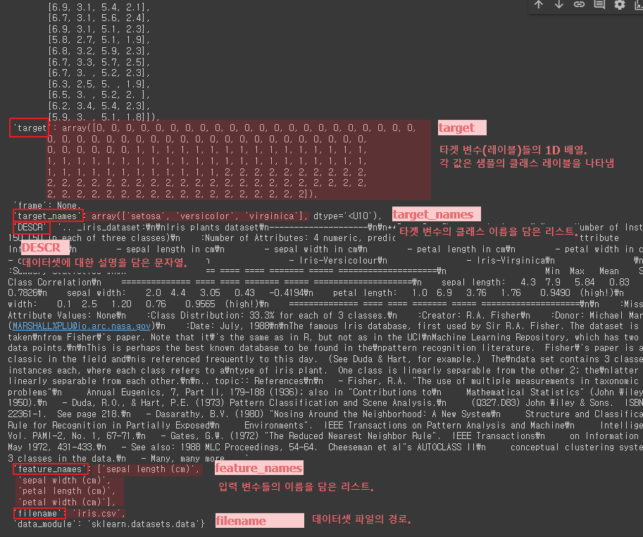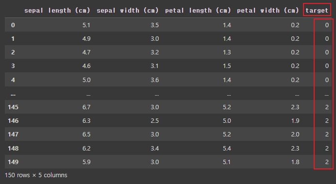 | 각 샘플에 대한 클래스 레이블을 나타내는 배열 : 클래스 0 (setosa), : 클래스 1 (versicolor), : 클래스 2 (virginica) target 배열 : 150개의 요소로 구성 (1차원 배열) |