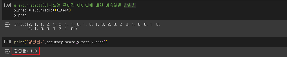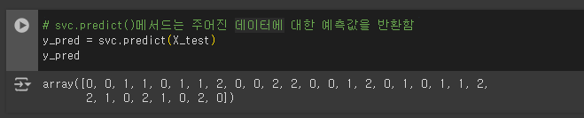 # svc.predict()메서드는 주어진 데이터에 대한 예측값을 반환함