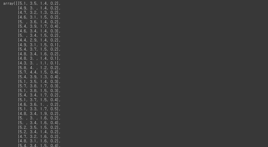 data = iris['data'] # 샘플데이터, Numpy 배열로 이루어져 있음