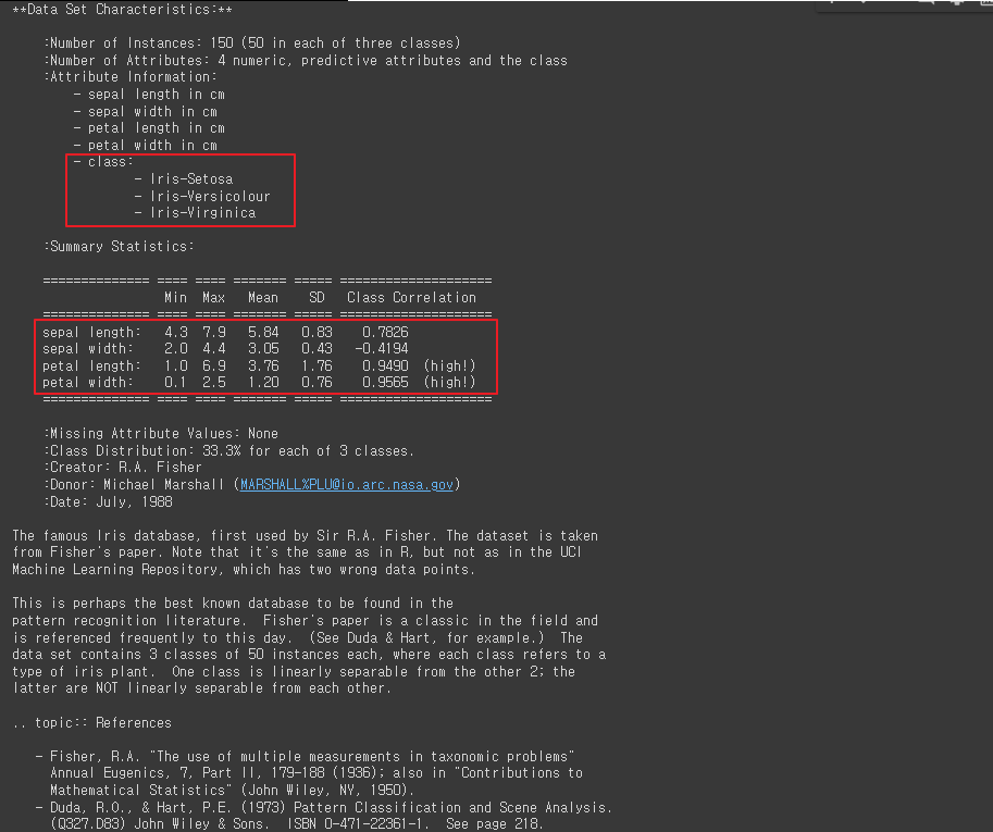 - iris 객체의 'DESCR' 속성을 출력