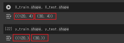 X_train = 훈련세트의 독립변수 행 : 120 / 열 : 4 X_test = 테스트세트의 독립변수 행 : 30 / 열 : 4 y_train = 훈련세트의 종속변수 120 요소(데이터 포인트) y_test = 테스트세트의 종속변수 30 요소(데이터 포인트) |