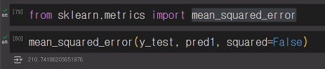 - mean_squared_error(y_test, pred1, squared=False) : MSE를 계산