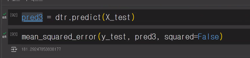 - 실제 값(y_test)과 의사 결정 트리 모델이 예측한 값(pred3) 사이의 루트 평균 제곱 오차(RMSE)를 계산
