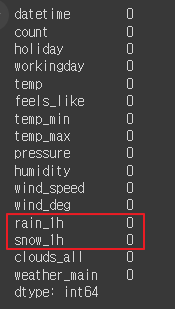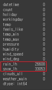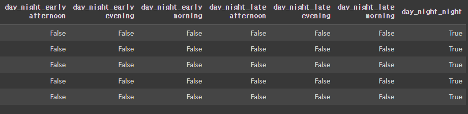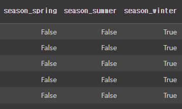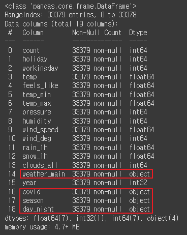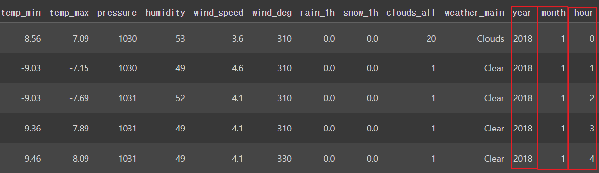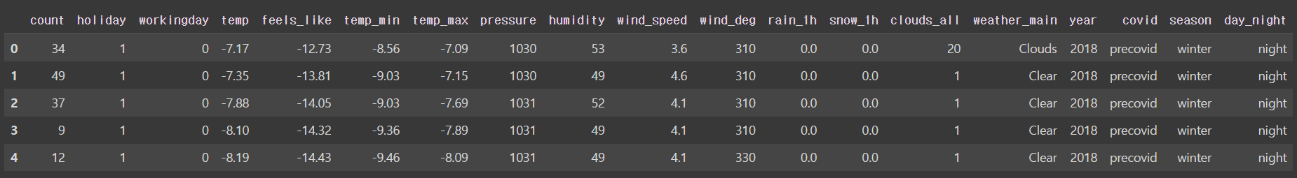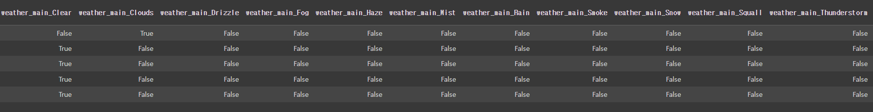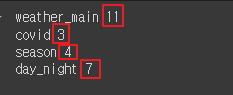 - 'weather_main', 'covid', 'season', 'day_night' 열 원핫인코딩
